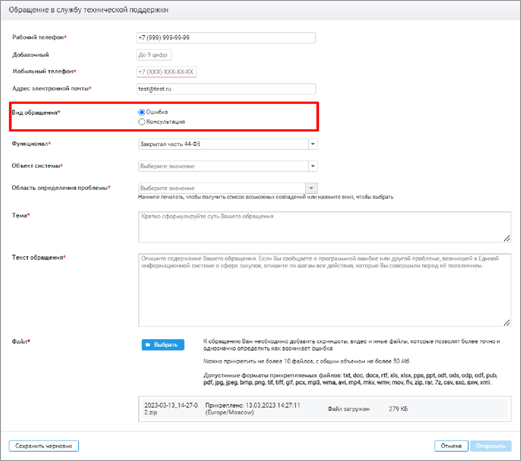 1. Корректно выбирайте тип обращения: «Консультация» или «Ошибка»
